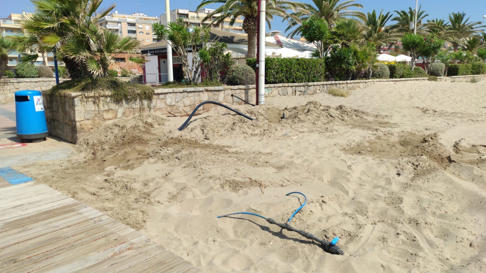 «que se puede apreciar el estado de las instalaciones esta misma mañana, con los lava pies todavía sin funcionar; además no están colocadas las pasarelas de madera en algunos tramos»