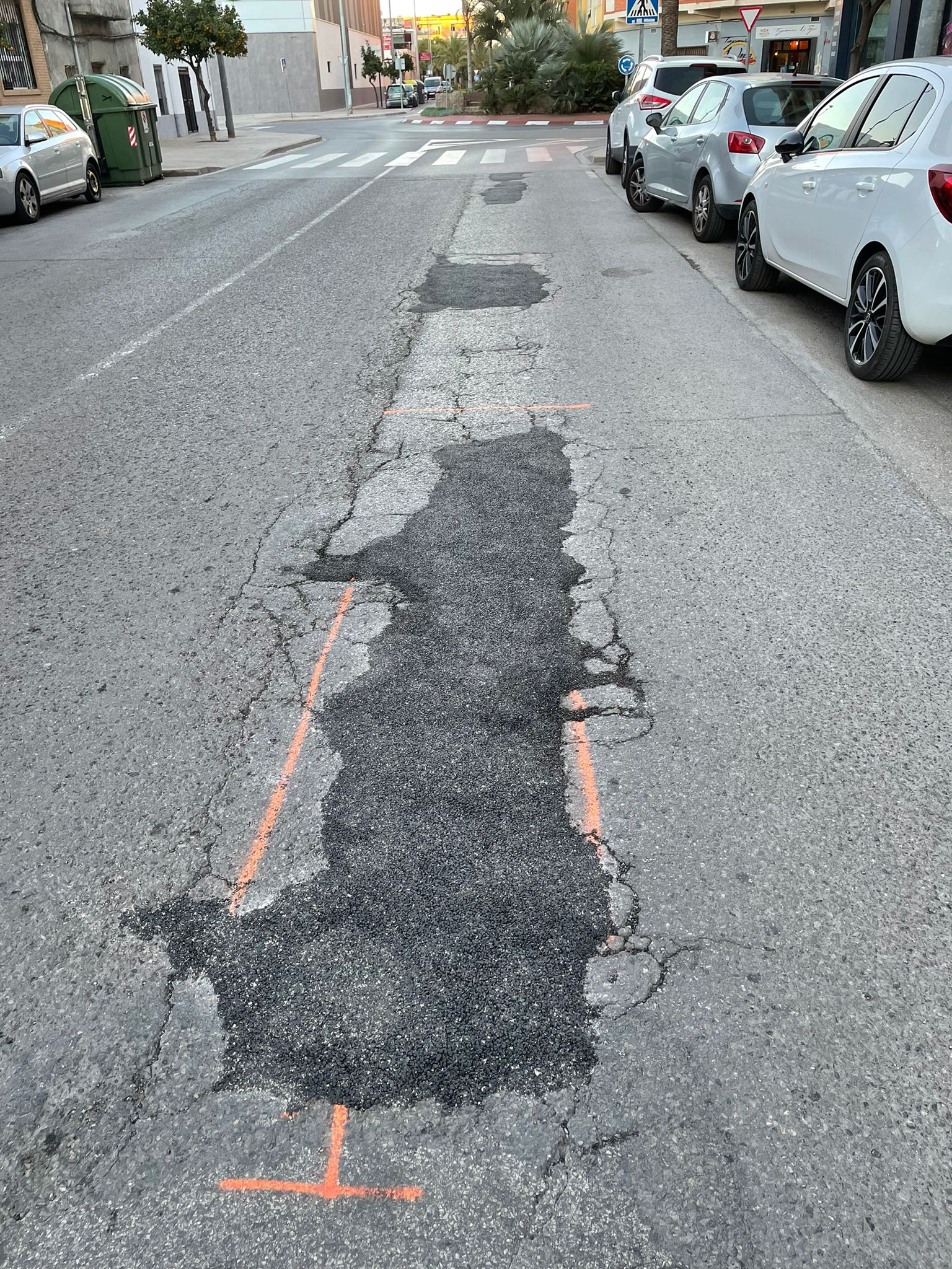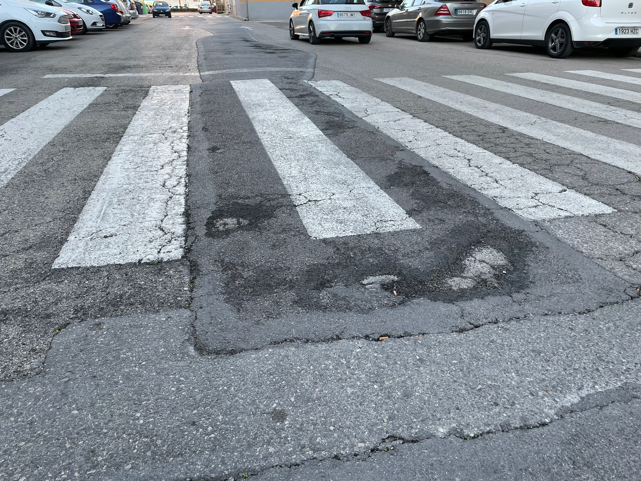 «Otras calles con mucho paso de vehículos como la calle San Vicente (donde se encuentran el Mercadona y Consum juntos) fueron parcheadas hace poco tiempo, y ahora nos encontramos esos parches destrozados, incluso se puede apreciar hasta 3 capas de asfalto. En esta misma calle algunos pasos de cebra se encuentran con esas reparaciones defectuosas y podrían provocar la caída de los peatones»
