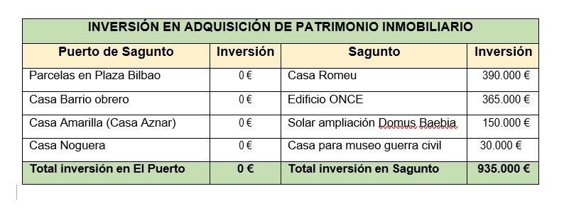numerosos ejemplos de adquisición de patrimonio mobiliario, pero curiosamente solo en Sagunto por lo que la excusa que siempre arguyen de que existen otras prioridades cae por su propio peso. Si esta fuera la razón no habría dinero para adquirir solares e inmuebles en uno y otro núcleo. Si sacamos números observaremos que en los últimos dos años la inversión patrimonial en El Puerto ha sido de 0 euros, y por el contrario en Sagunto la inversión ha sido de 935.000 euros.